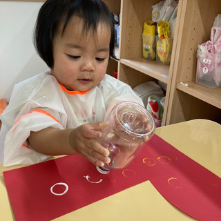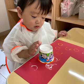 そして、その後は1人ずつ順番にクリスマスの製作です。赤い靴下にいろんな色の絵の具をペットボトルの飲み口やヨーグルトの縁につけてコンコン、ポンポン模様をつけました!みんな自分で持って上手に付けてましたよ。